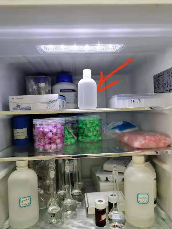 3)冰箱存放没有标签的药品(经检查为电极缓冲液KCl,已有沉淀,已倒入无机废液桶);