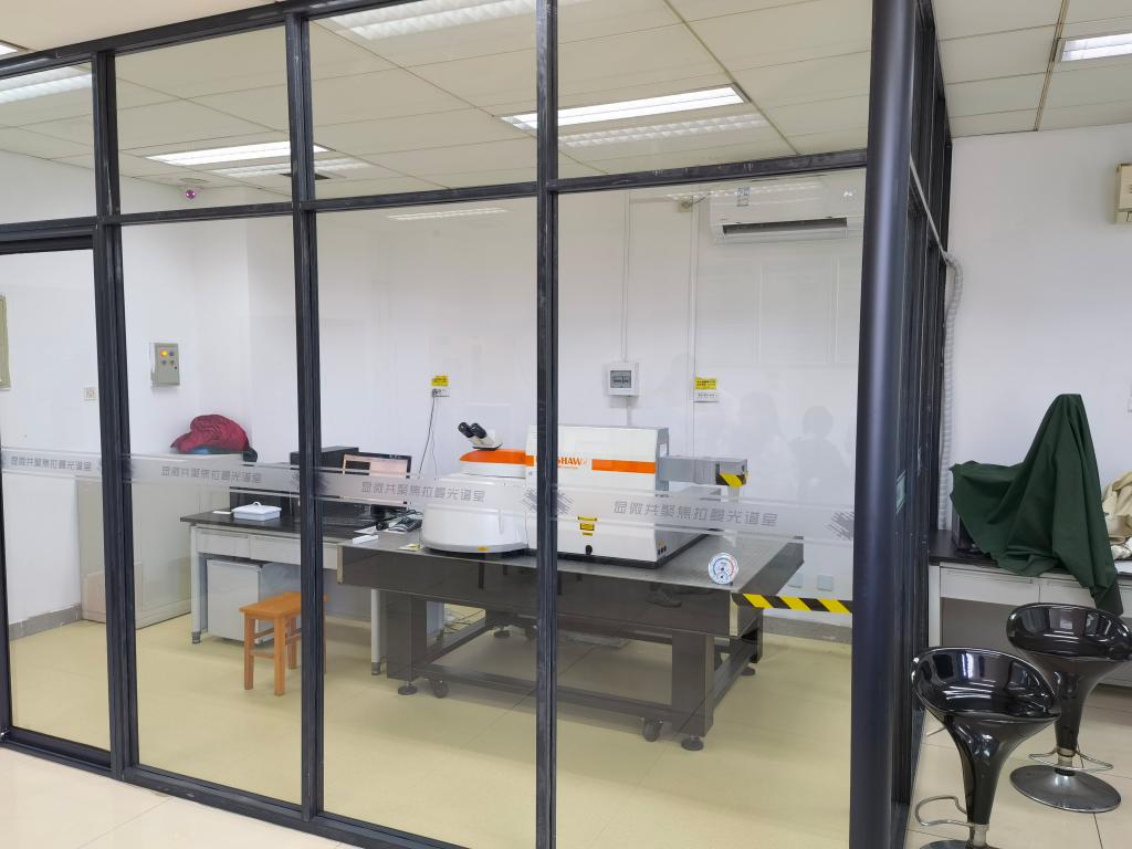 公司大型设备激光拉曼光谱仪因原存放位置存在灰尘污染、噪音振动大影响光路稳定性等问题而使用率低,故障频发。经院领导积极协调,实验中心与雷尼绍工程师充分沟通,最终确认方案在格物楼1113规划玻璃隔间,配备空调、除湿机、静电地胶以达到仪器防尘、恒温、恒湿的要求。于2021年6月初完成相关施工,配套设施安装并进行了仪器的搬迁。