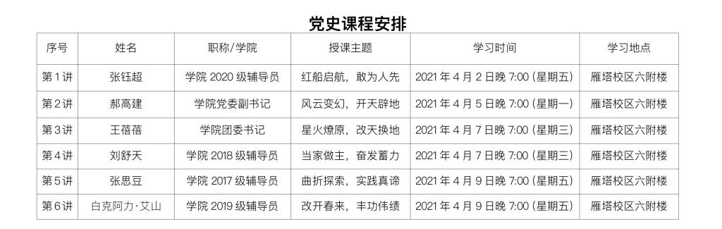 与此同时,365英国上市官方网站党课团课擂台赛也在有序。根据《365英国上市官方网站关于举办“红色青春耀百年”党课团课擂台赛的通知》要求,公司2019级、2020级本科生在雁塔校区教学五楼分别举办了“红色青春耀百年”党课团课擂台赛初赛。各团支部结合专业特色,围绕基础党务、团学知识,理论学习、榜样教育、精神文化等内容进行比赛。《山河无恙在我心,祖国有我请放心》、《新时代共青团员应透过疫情防控进一步坚定“四个自信”》、《以青春宏图,映锦绣中华》、《三会两制一课》等充分展示了青年团员扎实的理论学习基础和富于青春朝气的表达。