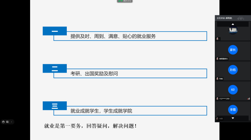 党委副书记郝高建老师对就业环境进行了分析,说明了召开家长会的原因,然后对公司近年的就业情况进行了分析,并深入剖析了部分员工就业难的原因。接着,详细介绍了公司围绕就业开展的工作。最后就家长如何帮助员工做好就业工作进行了指导,他提到员工和家长应当了解国家政策和就业形势,对员工自身要有准确的了解和定位,并且要多方位获取就业信息,主动积极参与就业等,希望家长多多与员工沟通,了解员工情况,对员工定位清晰,为员工做好参谋,与公司一起共同促使员工顺利就业。