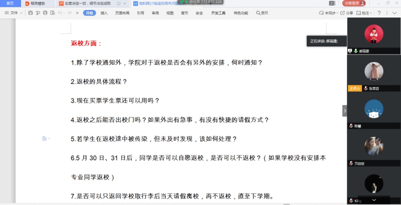 期间,各位老师就员工提出的关于返校时间、请销假等具体问题作了解答说明。最后,郝高建结合返校工作提出了几点要求:一是返校同学要认真学习公司的返校须知,严格按照要求做好返校前、返校中和返校后的各项准备及防护工作,确保身心健康;二是详细了解疫情防控期间相关规定和要求,遵守校纪校规及防疫期间的各项要求;三是要做好个人卫生和宿舍卫生,加强体育锻炼,增强体质;四是严格落实“一日三报”制度,主动做好“错峰就餐”“错峰洗澡”等环节;五是要加强沟通交流,遇到问题第一时间与辅导员及公司取得联系,便于解决。