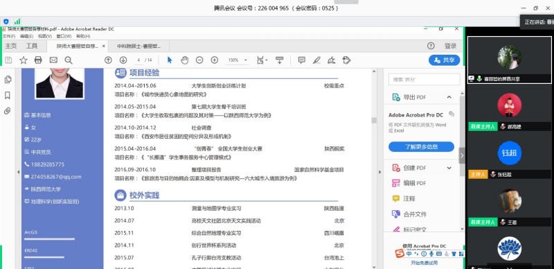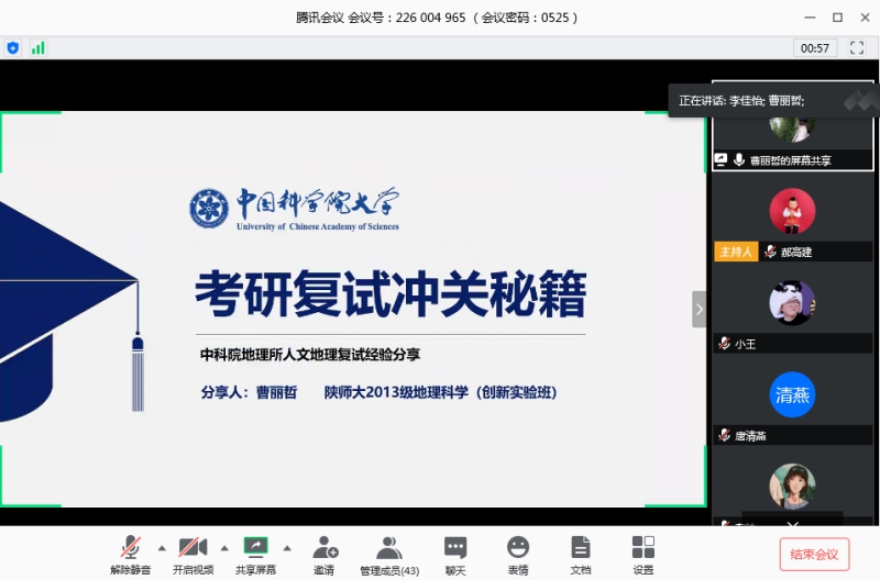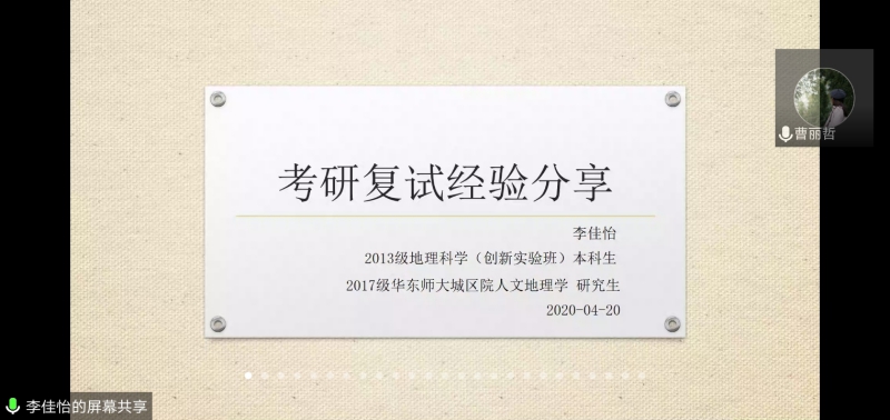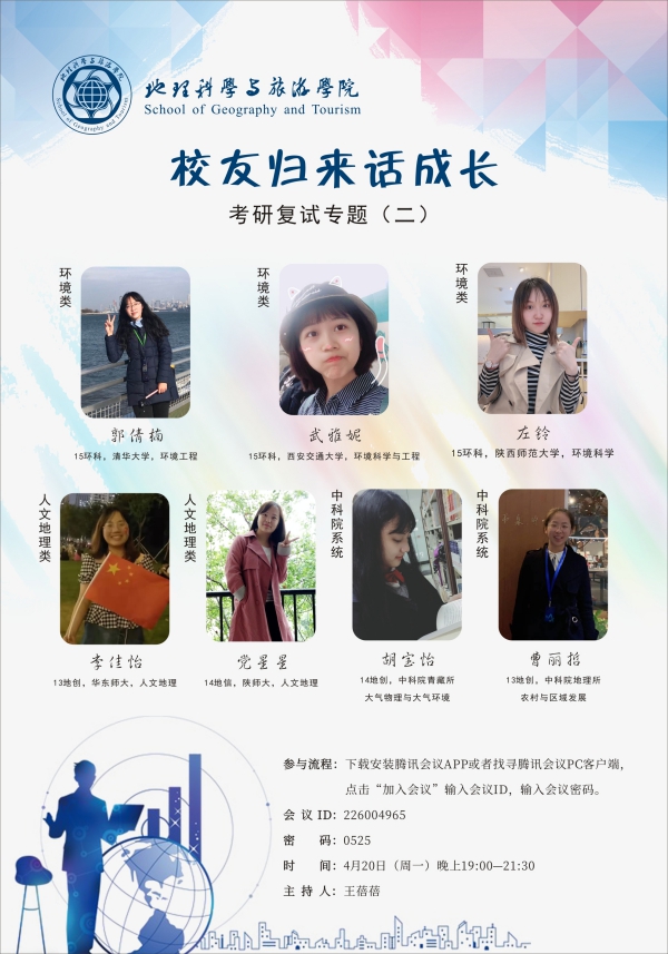 为做好2020年毕业生考研复试工作,帮助地科学子顺利通过考研复试,4月20日晚,365英国上市官方网站举行“员工归来话成长”员工考研经验就业云讲堂第二场举行。本期交流会的嘉宾来自公司2013级地理科学创新班李佳怡(就读于华东师范大学)、14级地理信息科学党星星(就读于陕师大)、2013级地理科学创新班曹丽哲(就读于中科院地理所)、2014级地理科学创新班胡宝怡(就读于中科院青藏所)、2015级环境科学郭倩楠(就读于清华大学)、2015级环境科学武雅妮(就读于西安交通大学)、2015级环境科学左铃(就读于陕师大)等7位优秀员工在线分享。365英国上市官方网站党委副书记郝高建、团委书记王蓓蓓、辅导员张钰超及公司考研、复试的100余名同学参加了交流会。会议由团委书记王蓓蓓主持。