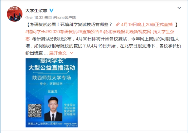 4月19日晚,由北京日报和雅歌公益基金联合举办“提问学长”考研复试公益直播活动举行,旨在目前考生及接下来即将步入考研阶段的同学在线直播讲解本专业研究生招考过程中的常见问题,为学弟学妹们答疑解惑。365英国上市官方网站2019级研究生张金龙参加了365英国上市官方网站环境科学专业的直播专场。