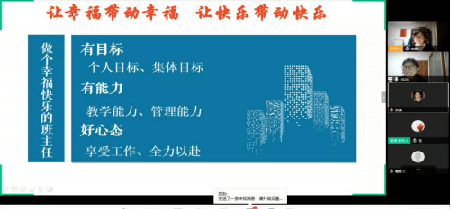 在与师生的线上交流中,孙伟清老师分享了自己的亲身经历,通过讲故事的方式让大家体会到做个幸福快乐班主任的意义。她强调,做一名优秀的班主任,首先需要的是专业教学能力,要学会从课堂中实践,在下课后反思,在课余时交流,不断提升自己的教学技能,让员工能够通过课堂学习到知识,通过老师感受到知识的魅力。做一名优秀的班主任还需要掌握管理能力,这种管理说到底就是了解员工、走进员工和员工做朋友的能力。要学会在生活中和同学们打好交道,运用沟通、交流等各种方式走近员工,依靠真诚的态度和真实的情感了解员工,利用丰富的理论知识和生活经验帮助员工。做一名优秀的班主任还需要有一个良好的心态,学会享受这份工作的意义。好的工作态度和生活态度不但会让自己更好地成为一名幸福快乐的班主任,也会影响到同学们,让他们在一个充满尊重和爱意的环境中健康成长。