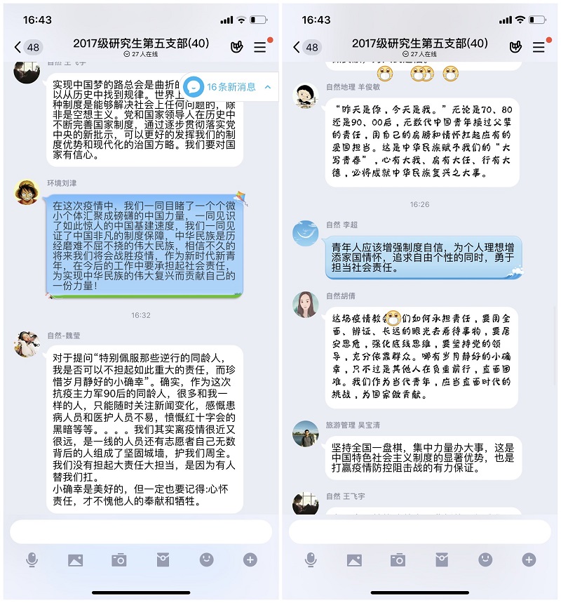 2016级研究生兼职辅导员张钰超说,在此次新冠肺炎疫情中,中国共产党领导中国人民,众志成城,创造了一系列的战“疫”中国速度、中国奇迹,充分展现了中国共产党的领导是中国特色社会主义制度的最大优势的这一特点。同时,在此次战“疫”中,90后,00后等新生代力量也担起了时代的责任。曾经是你,今天是我,作为中国青年的我们要接好时代的交接棒,在新时代中跑出更好的成绩,为中华民族伟大复兴的中国梦而努力奋斗。
