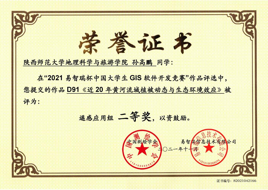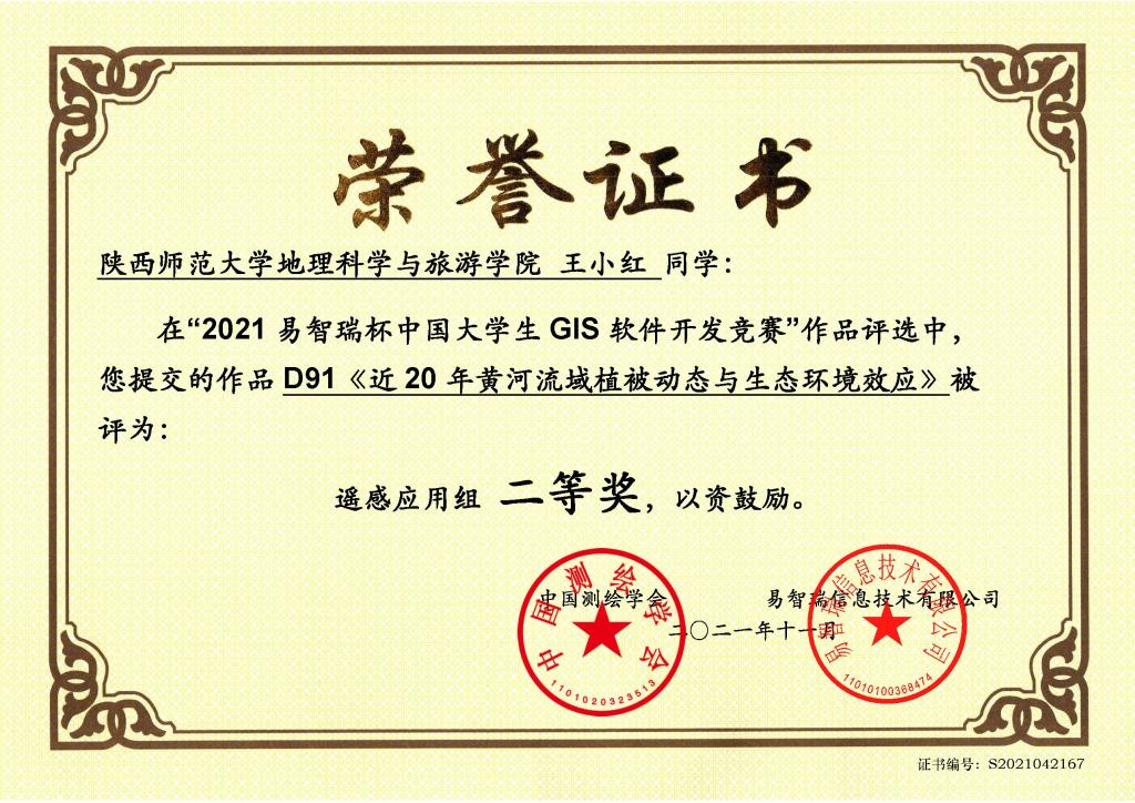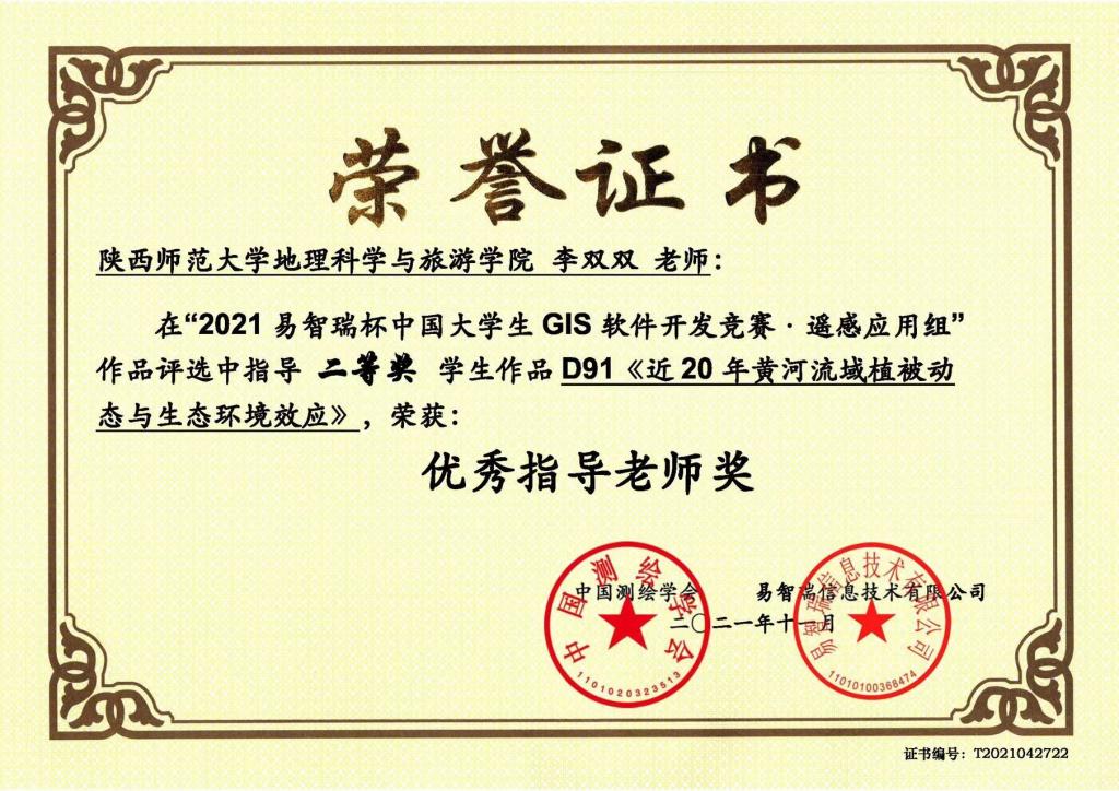 公司2020级硕士研究生孙高鹏、王小红和马慧榕,在青年教师刘宪锋和李双双的指导下,提交作品《近20年黄河流域植被动态与生态环境效应》,获得遥感应用组二等奖,刘宪锋和李双双被评为优秀指导教师。