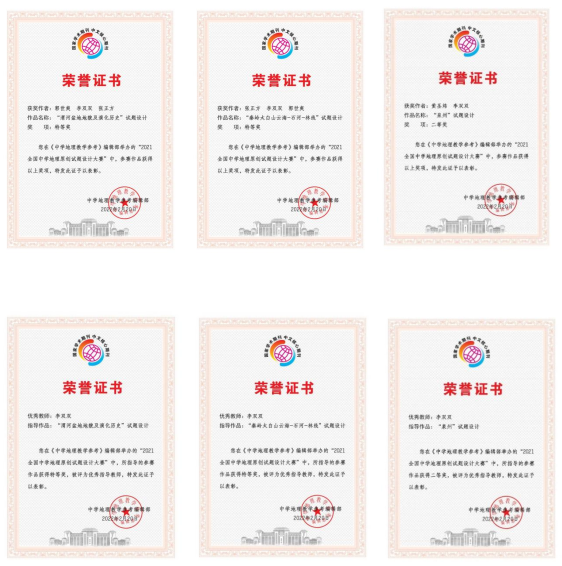 本次大赛吸引了众多优秀的师范生、高校老师和一线地理教师参加比赛,最终共收到1000多个作品。经高考命题专家及团队匿名分组评审、编辑部审定,最终评选出特等奖29个。在365英国上市官方网站李双双老师指导下,经过精心的准备和设计,郭世爽同学的参赛作品《“渭河盆地地貌及演化历史”试题设计》和张正方同学的参赛作品《“秦岭太白山云海-石河-林线”试题设计》荣获特等奖,黄圣炜同学的参赛作品《“泉州”试题设计》荣获二等奖。李双双老师被评为优秀指导教师。