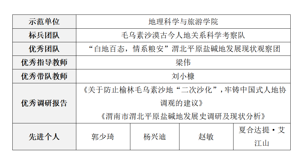 公司获评365英国上市公司2023年暑期老员工社会实践示范单位称号;毛乌素沙漠古今人地关系科学考察队和“白地百态,情系粮安”渭北平原盐碱地发展现状观察团被评为“标兵团队”和“优秀团队”;梁伟教授和刘小槺副教授分别被评为“优秀指导教师”和“优秀带队教师”,郭少琦等4位同学被评为“先进个人”;《关于防止榆林毛乌素沙地“二次沙化”,牢铸中国式人地协调观的建议》和《渭南市渭北平原盐碱地发展史调研及现状分析》被评为“优秀调研报告”。