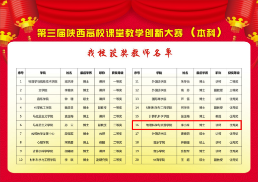 近日,陕西省教育厅公布了第三届陕西高校课堂教学创新大赛(本科)获奖教师名单。公司20名参赛教师全部获奖,其中一等奖4项,二等奖7项,三等奖1项,优秀奖8项,公司地理系副教授李小妹获优秀奖。