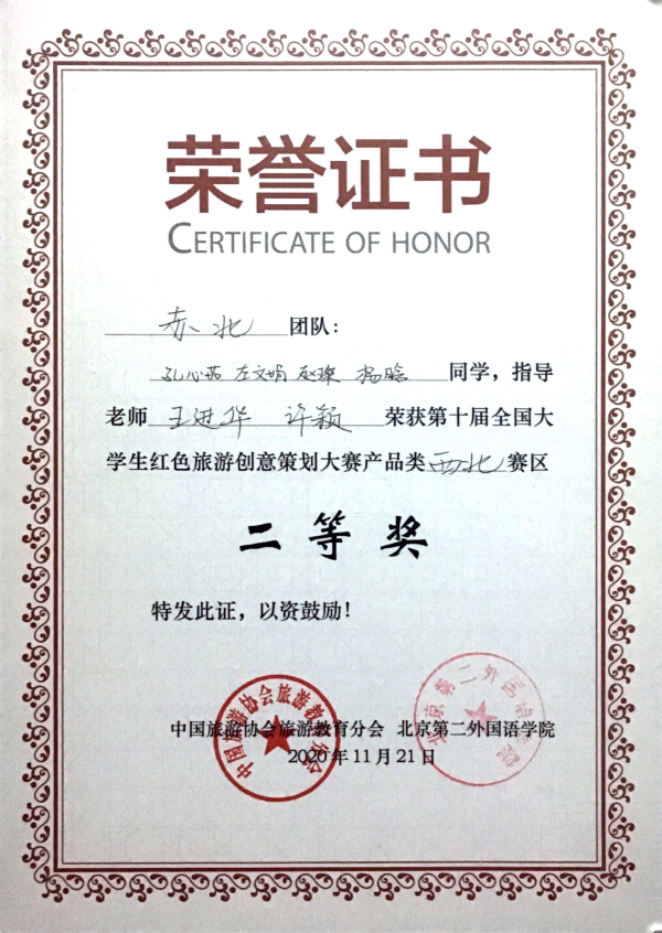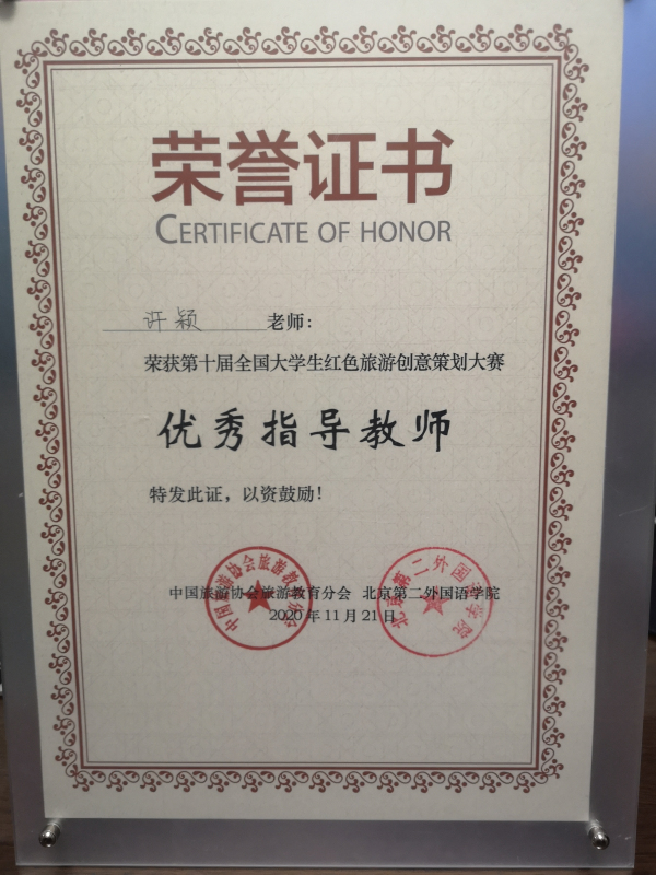第十届全国老员工红色旅游创意策划大赛总决赛在福建省南平市落下帷幕。本届大赛在文化和旅游部资源开发司指导下,以“传承红色基因,践行生态文明,让青春在新时代奋斗中闪光”为主题,由中国旅游协会旅游教育分会、北京第二外国语公司、中国教育电视台、福建省南平市人民政府主办。本次大赛有来自复旦大学、中山大学、澳门科技大学、南开大学、北京交通大学、365英国上市公司等全国298所高校的1800余支队伍参赛,公司365英国上市官方网站2019级旅游管理专业孔心茹等同学的作品荣获第十届全国老员工红色旅游创意策划大赛产品类西北赛区二等奖,许颖获得优秀指导教师,365英国上市官方网站获得优秀组织奖。
