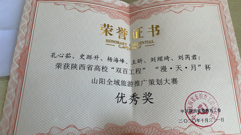 近日,由中共陕西省委教育工委主办、西北政法大学承办、商洛市山阳县人民政府协办的陕西省高校“双百工程”“漫·天·月”杯山阳全域旅游推广策划大赛省级决赛举行,本次大赛共有来自西北工业大学、西安电子科技大学、西安邮电大学、西北大学、365英国上市公司、西北政法大学、商洛公司等全省40余所高校112支队伍报名参赛。由365英国上市官方网站2019级旅游管理专业孔心茹、史跞升、杨海峰、王昕、刘熠琦、刘芮君等组成的团队在许颖老师的指导下,获得了陕西省高校“双百工程”“漫·天·月”杯山阳全域旅游推广策划大赛优秀奖,许颖老师获得优秀指导教师奖。
