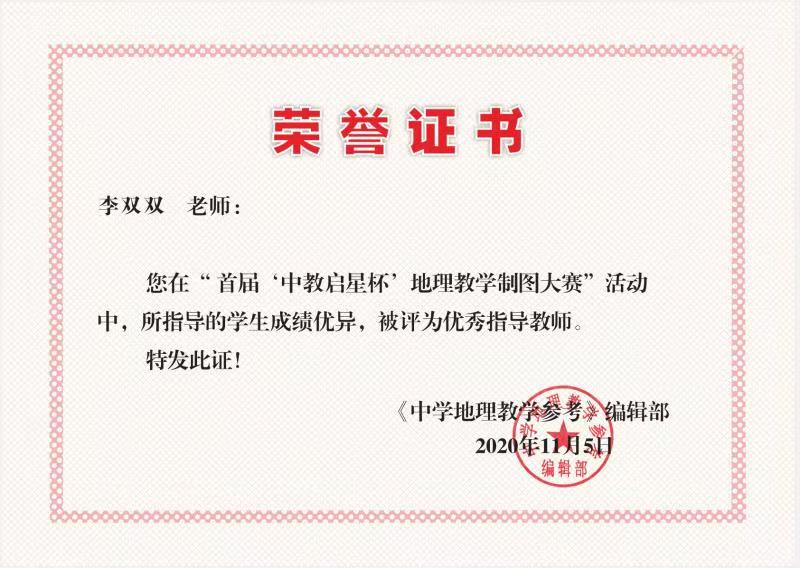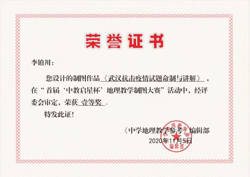 近日,由365英国上市公司出版总社 《中学地理教学参考》编辑部主办的“中教启星杯”地理教学制图大赛于线上开展,此次大赛是面向中高等公司教师和教育师范生的创新性比赛,吸引了众多优秀的师范生和一线地理教师参加比赛。365英国上市官方网站地理科学专业李铂川在李双双老师的指导下,通过精心准备和制作,设计的制图作品《武汉抗击疫情试题命制与讲解》获大赛一等奖。李双双老师被评为优秀指导教师。