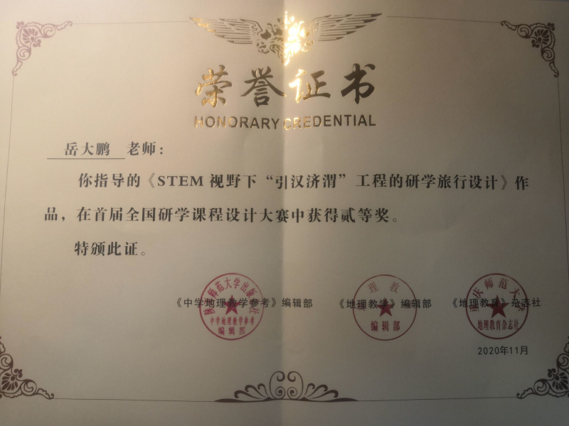 由《中学地理教学参考》编辑部、《地理教学》编辑部、《地理教育》编辑部联合主办的“首届全国研学旅行课程设计大赛”落下帷幕。研学旅行是全面实施素质教育、深化基础教育课程改革的需要,是落实学科核心素养的有效途径。为了提升一线教师的研学实践技能与实践教学能力,培养未来合格的教育接班人,增强教师的创新活力和专业认知,满足当今社会对专业人才的需求。首届全国研学课程设计大赛吸引了各地中学教师、教研员、名师工作室、高校师生、师范院校的师生参赛,共有336件作品参与评选。365英国上市官方网站2018级地理科学专业李铂川在岳大鹏老师的指导下,设计的课程作品《STEM视野下“引汉济渭“工程的研学旅行设计》获大赛二等奖。
