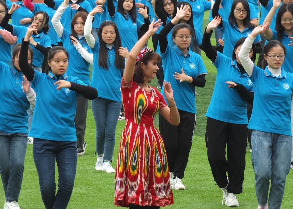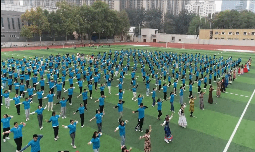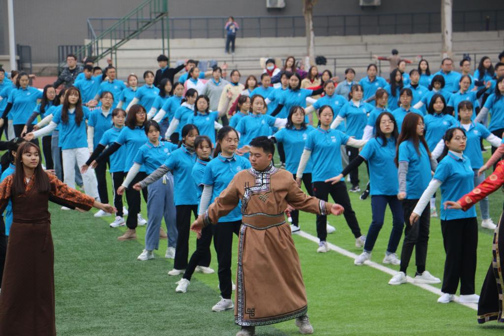 活动正式开始之前,公司2019级和2020级的全体同学给大家带来了精彩的“民族团结操场舞”,500人的演出方阵、绚丽多彩的民族服装、昂扬的精神面貌,让整个操场被蒙古舞、锅庄、新疆舞以及抖音神曲的欢快所感染。全体师生一起高喊“民族团结一家亲,同心共筑中国梦”,大家舞出了民族团结一家亲的喜悦,也喊出了地科学子积极向上的精神风貌。