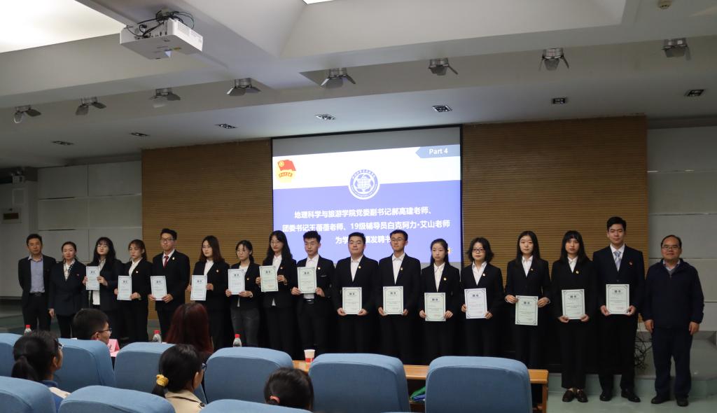 主席团成员张雨婷、李铂川、吴鸿宇从党委书记郝高建老师手中接过员工会旗帜,作为新一届的主席团成员他们表示,经天纬地,是每一名地科人的信仰;知行合一,是每一名师大人的追求。在员工会改革的大背景下,大家将继承和发扬地科院员工工作的优良传统,明确为同学服务的宗旨,以“地科精神”为指引团结一致续写员工会工作的新篇章。
