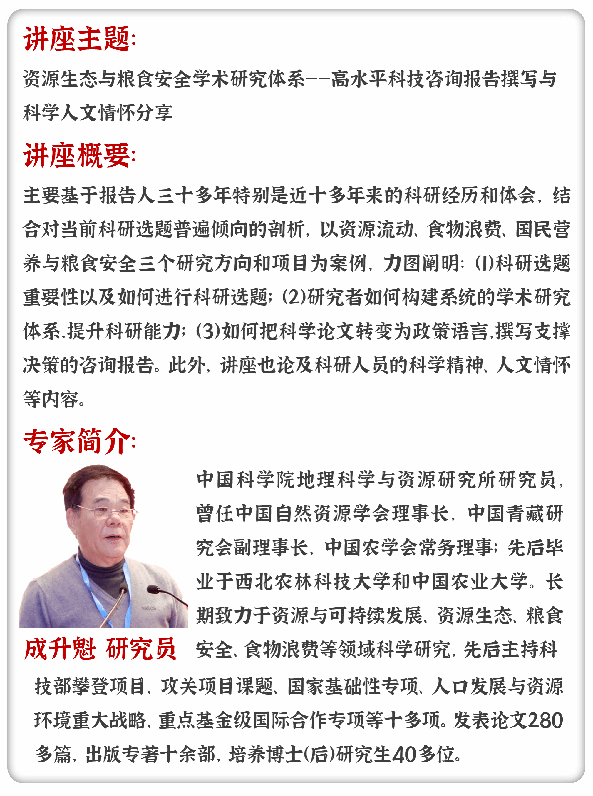 本次专题论坛受到广大中青年学者和研究生的高度关注,论坛将邀请自然资源领域内具有重要学术影响力的专家学者,分享他们在高水平科研项目设计、期刊论文写作、科技奖励申报、科技咨询服务等方面的宝贵经验和心得。论坛聚焦从科研选题到论文发表再到科技咨询的完整链条,探讨学术论文写作技巧、学术研究创新与学术价值提升路径,并通过案例剖析和专题融合讲解,为科研人员呈现多学科、多领域、多方法的交叉视角。应邀专家还将结合征集的论文案例详细阐述如何精准挖掘选题、合理谋篇布局、构建科研学术思维,并针对投稿、审稿、修稿环节的关键问题提供专业建议,为有志于在国内外高水平期刊上发表研究成果的学者提供实用指导。