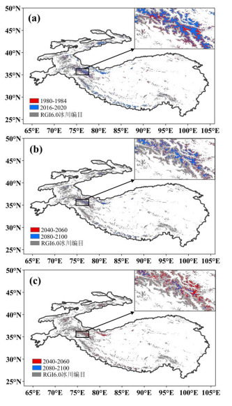 图3 亚洲高山区冰川积累区在1980-1984和2016-2020(a),以及SSP2-45(b)和SSP5-85(b)情景下分别在2041-2060年和2081-2100年的分布