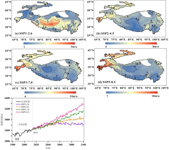 图2 不同情景下亚洲高山区冰川ELA变化趋势的空间分布(a-d),以及1979-2100年空间平均的ELA随时间的变化(e).