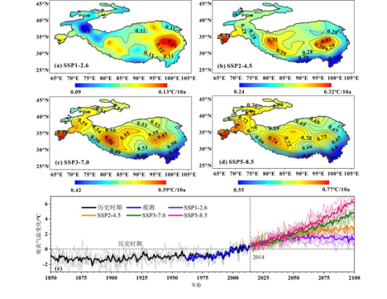 研究首先明确了亚洲高山区温度在1979-2100年的时空变化。相对于1850-1900年,亚洲高山区年平均温度已经在2016年升高了1.5℃。在SSP1-2.6、SSP2-4.5、SSP3-7.0和SSP5-8.5情景下亚洲高山区年平均温度都将在2028年左右升高2℃,而到2040-2060年将分别升高2.51℃、2.84℃、3.08℃和3.39℃,到2080-2100年则分别升高2.65℃、3.76℃、5.35℃和6.44℃(图1)。
